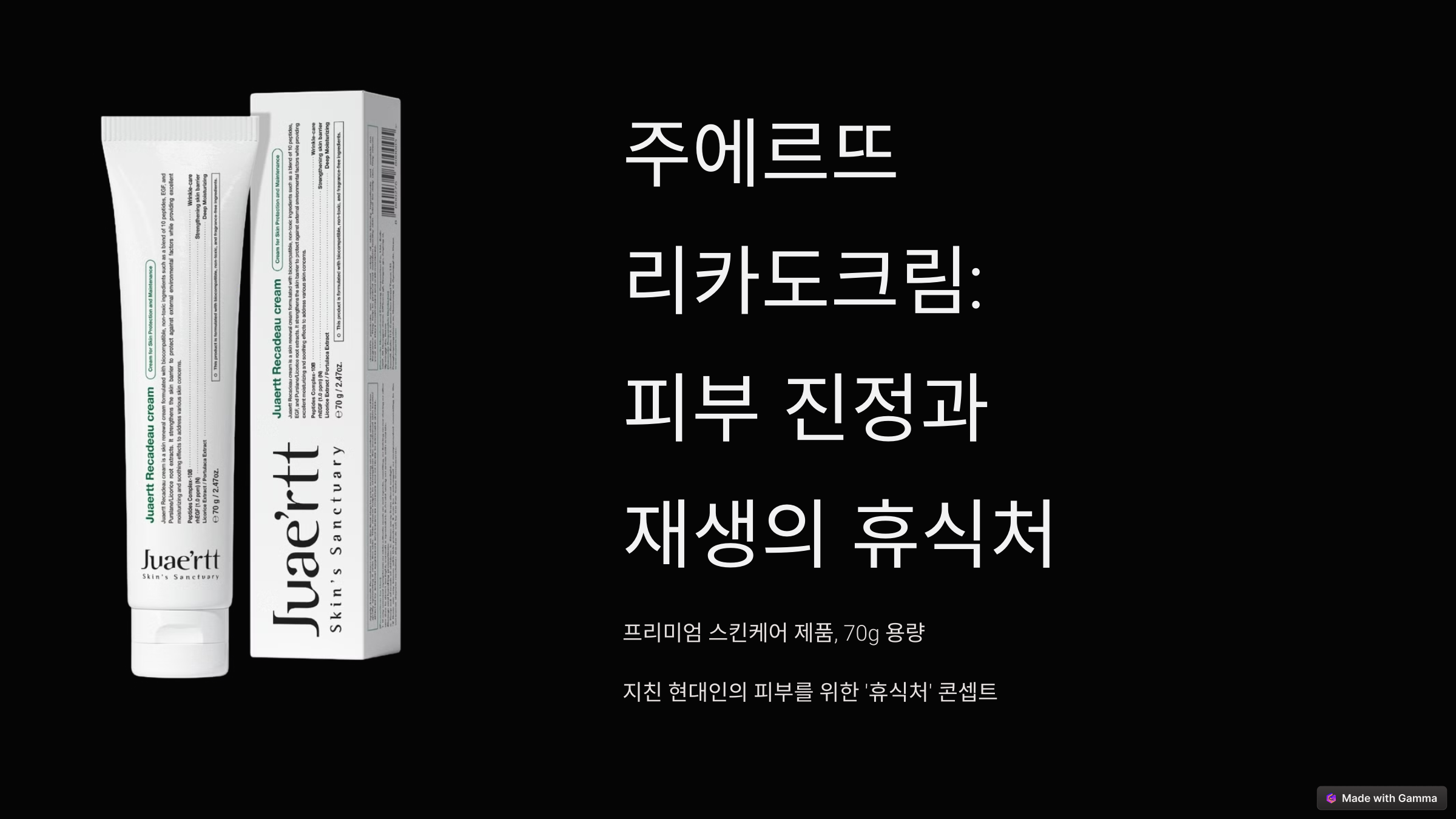 '주에르뜨' 리카도크림은 피부 진정과 재생에 특화된 프리미엄 스킨케어 제품입니다. 70g 용량으로 출시된 이 크림은 지친 현대인의 피부를 위한 '휴식처'라는 콘셉트를 담고 있습니다.