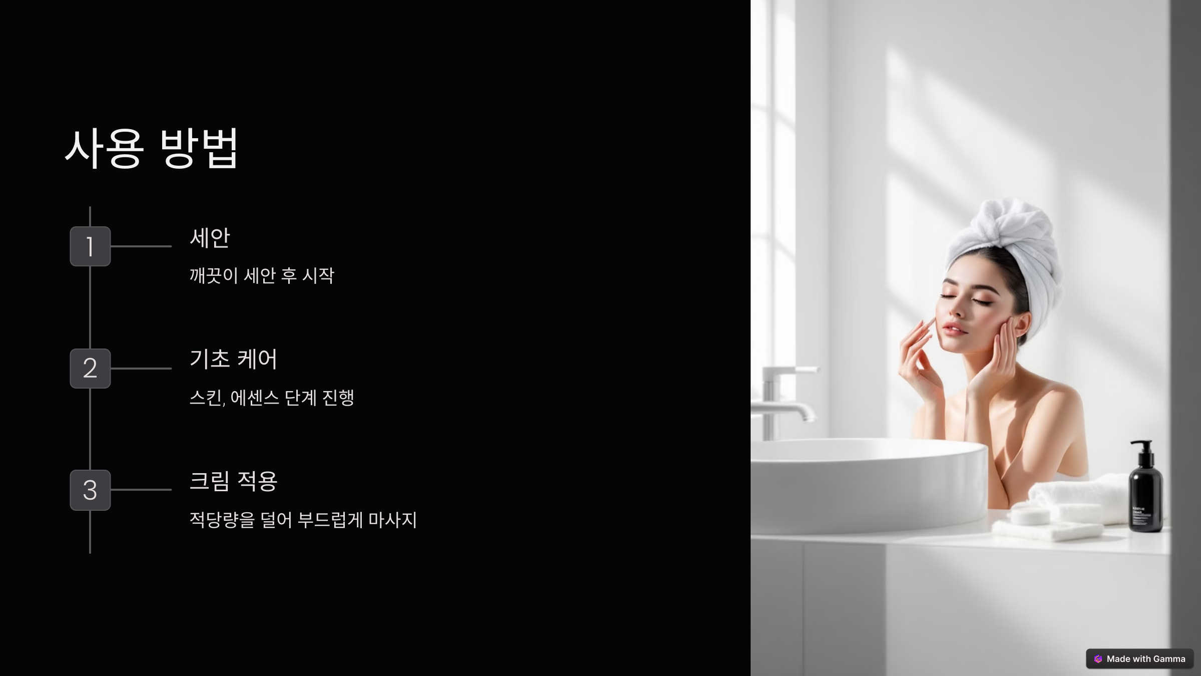 저녁 스킨케어 루틴의 마지막 단계에서 사용하시면 가장 효과적입니다. 세안 후 스킨, 에센스 단계를 거친 뒤 적당량을 덜어 부드럽게 마사지하듯 바릅니다.