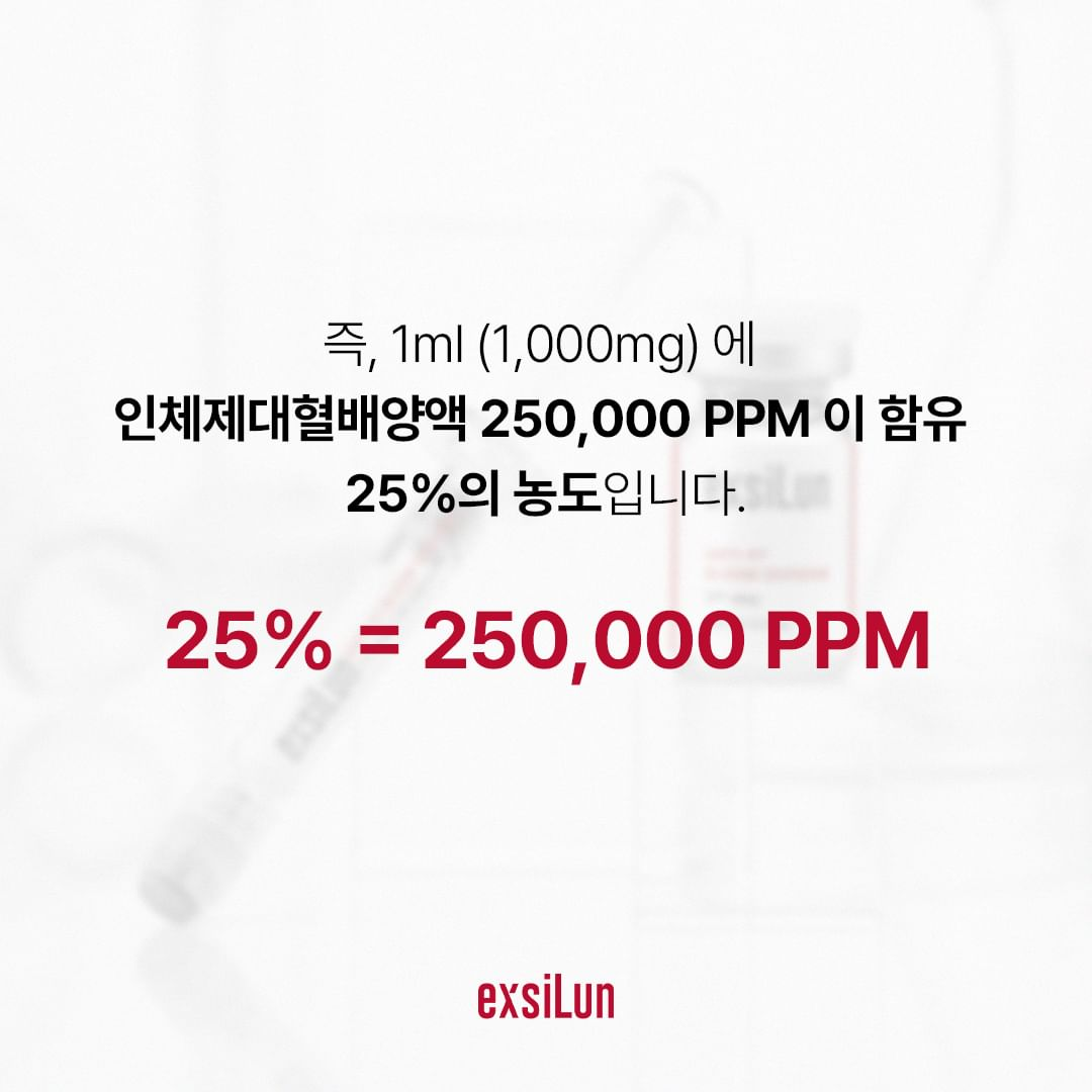 최근 일부 제품들은 PPM(Parts Per Million)을 이용해 농도를 과장하고 있습니다. PPM은 용액의 농도를 나타내는 단위로, 예를 들어 10,000 PPM은 용액의 1%를 의미합니다. 엑실런의 경우 1ml 기준 250,000 PPM(25%)의 인체제대혈세포배양액이 포함되어 있습니다. 하지만 일부 제품들은 mg 단위를 사용해 혼란을 주고 있습니다. 1ml는 1,000mg이므로, 제품의 실제 농도를 확인하시려면 1ml 기준으로 환산해 보시는 것이 중요합니다.