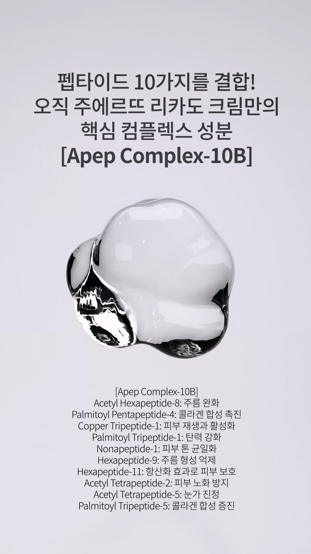 리카도크림의 핵심은 10가지 펩타이드 복합체인 'Apep Complex-10B'입니다. 각각의 펩타이드는 특별한 기능을 가지고 있어 시너지 효과를 발휘합니다.