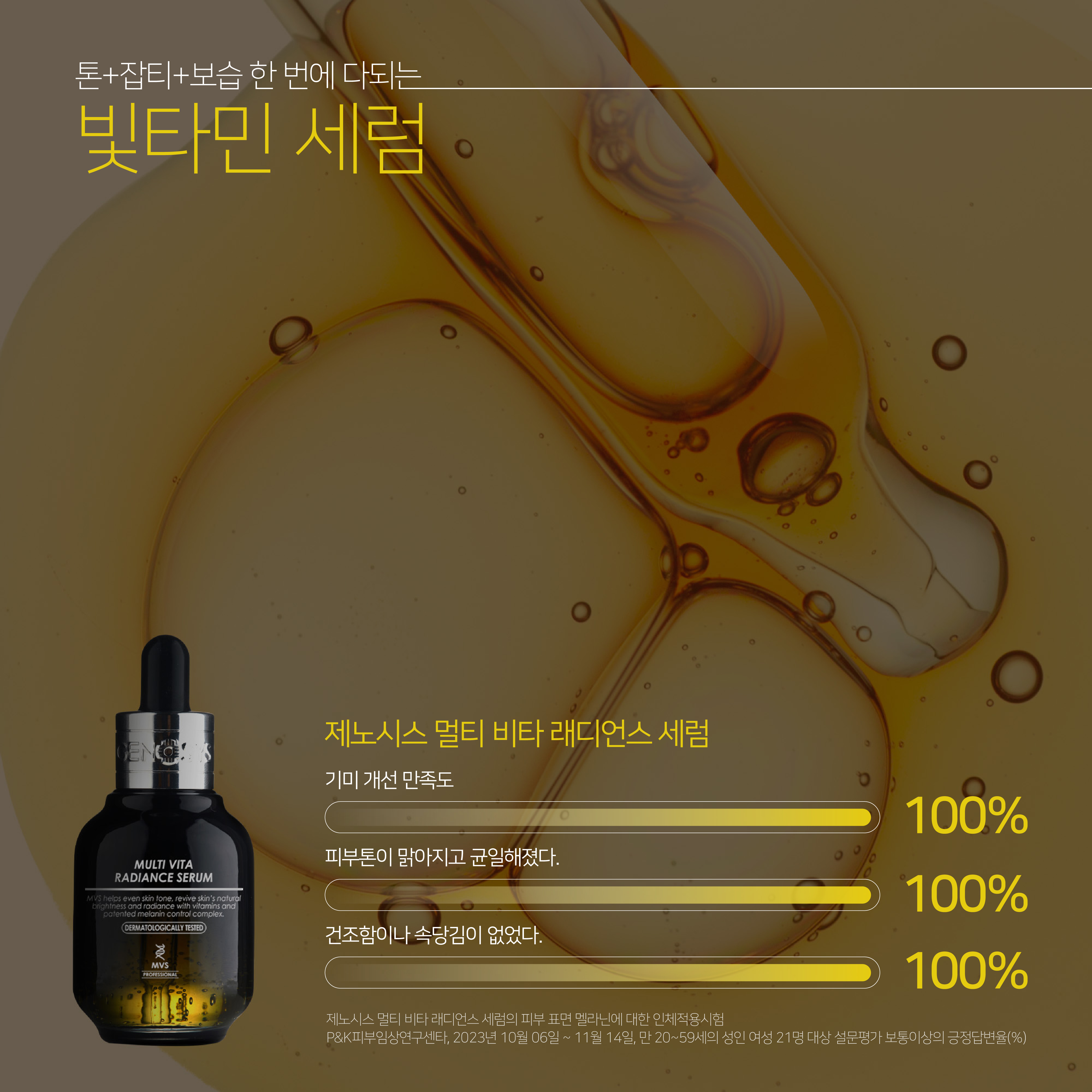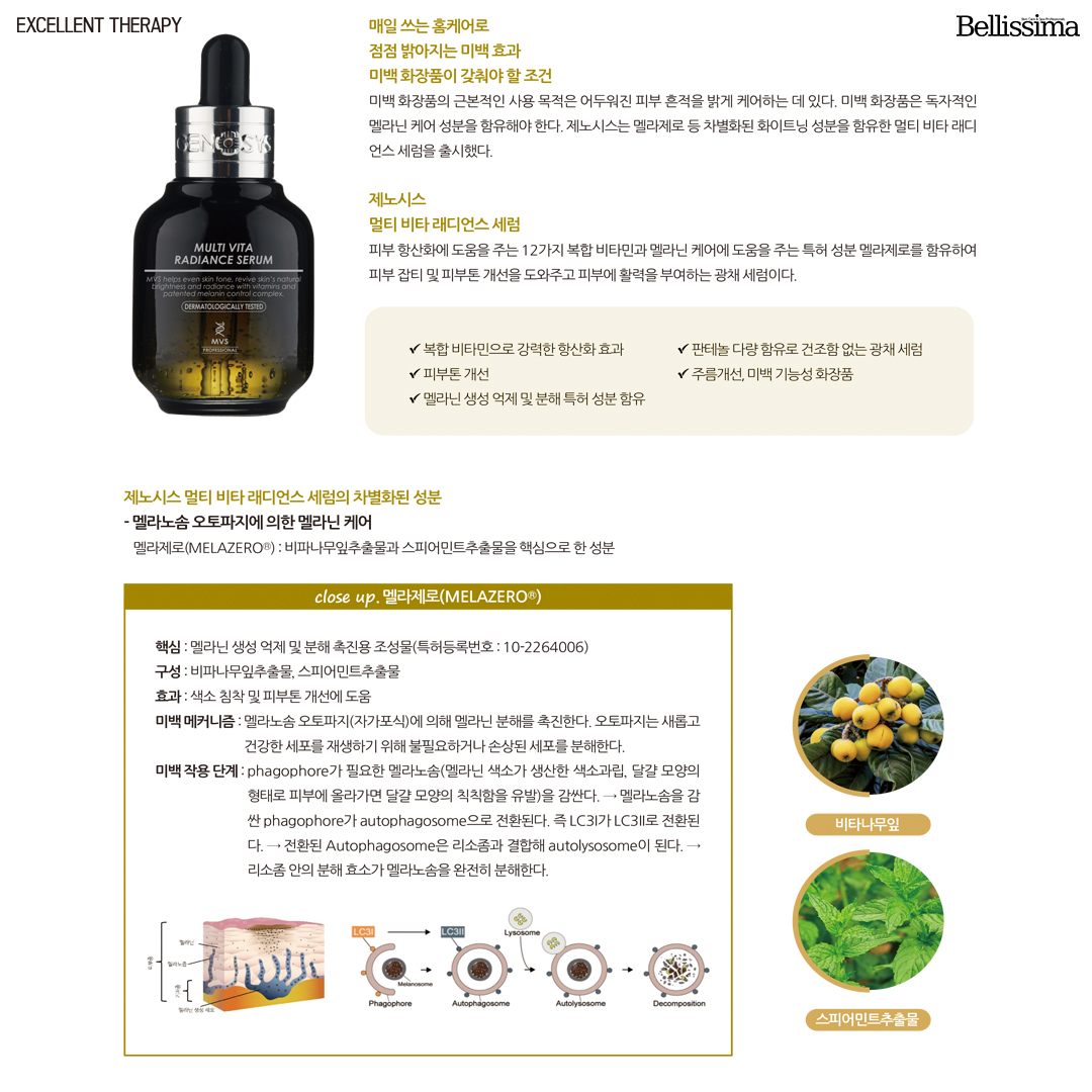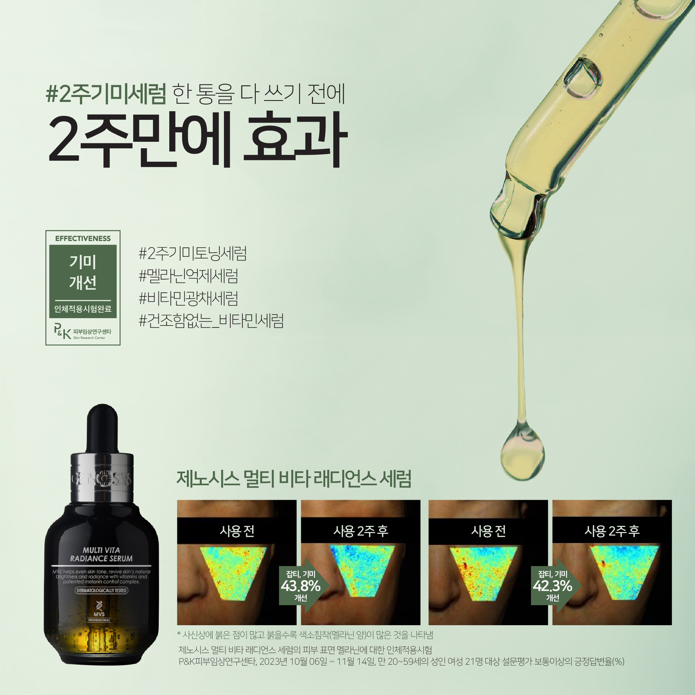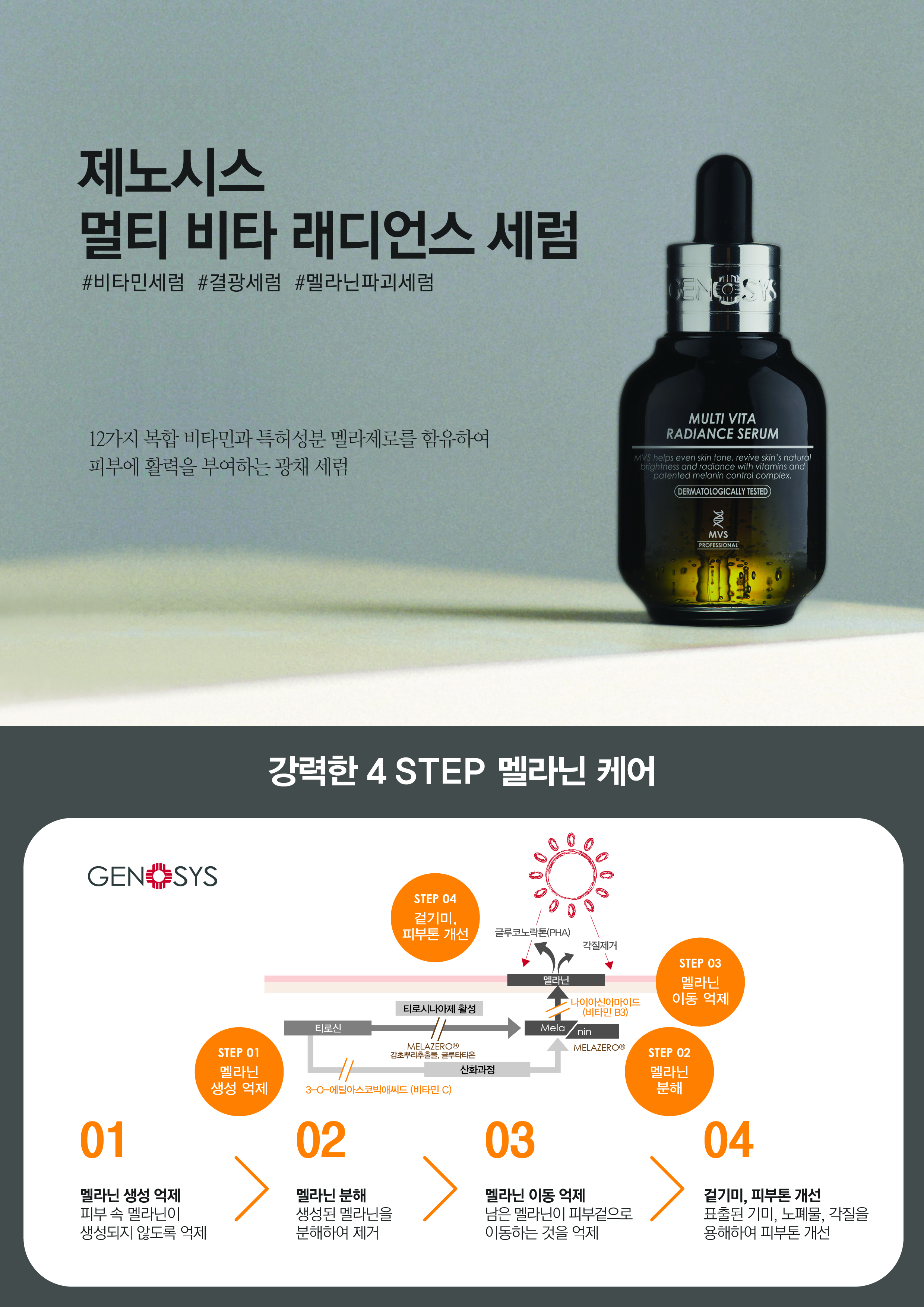 제노시스 멀티 비타 래디언스 세럼은 과학적으로 입증된 성분들을 통해 멜라닌 케어의 새로운 기준을 제시합니다.