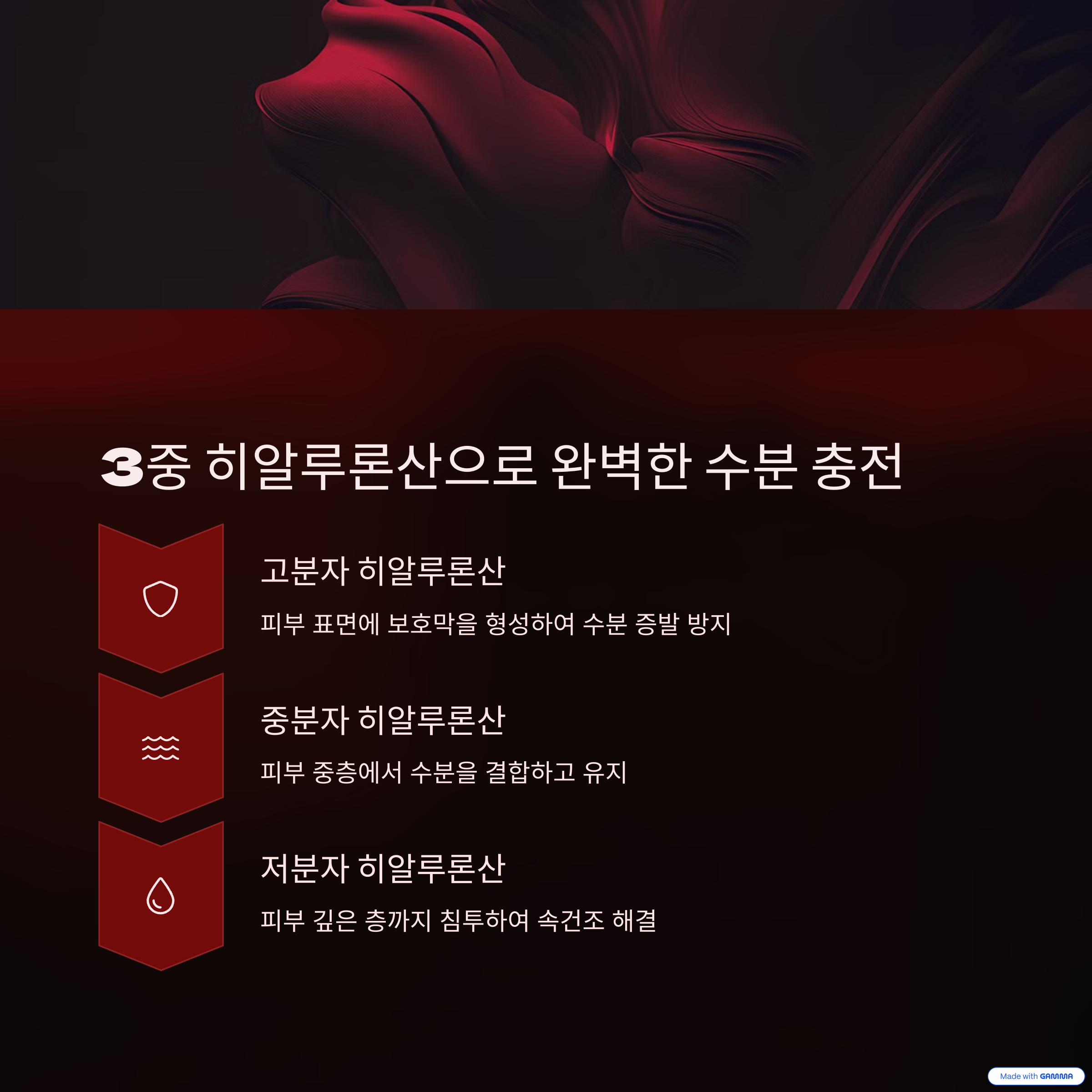 다양한 크기의 히알루론산이 층별로 작용하여 피부 속부터 겉까지 빈틈없이 수분을 채워주며, 사용 후에도 끈적임 없이 산뜻한 마무리를 선사합니다.