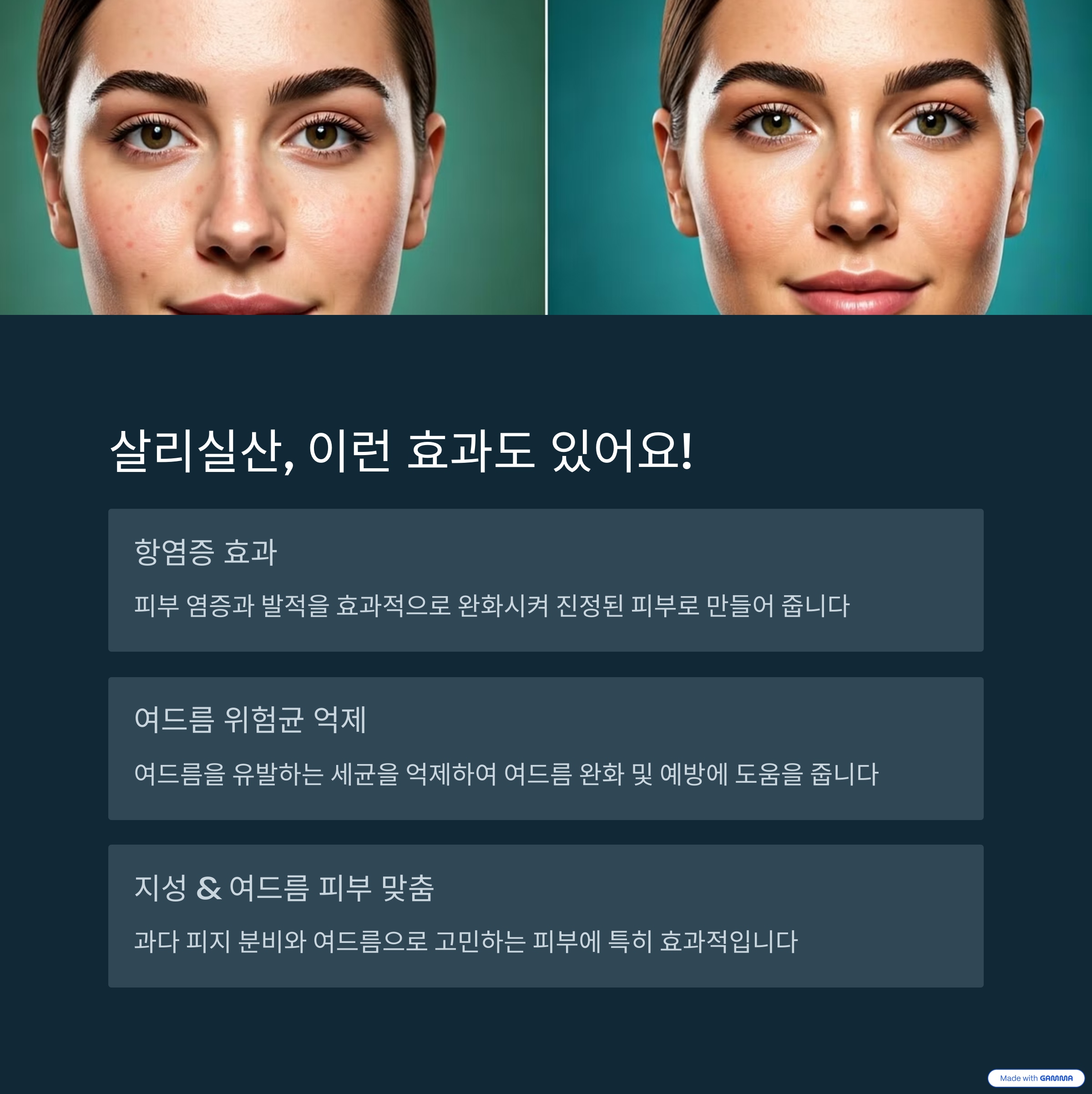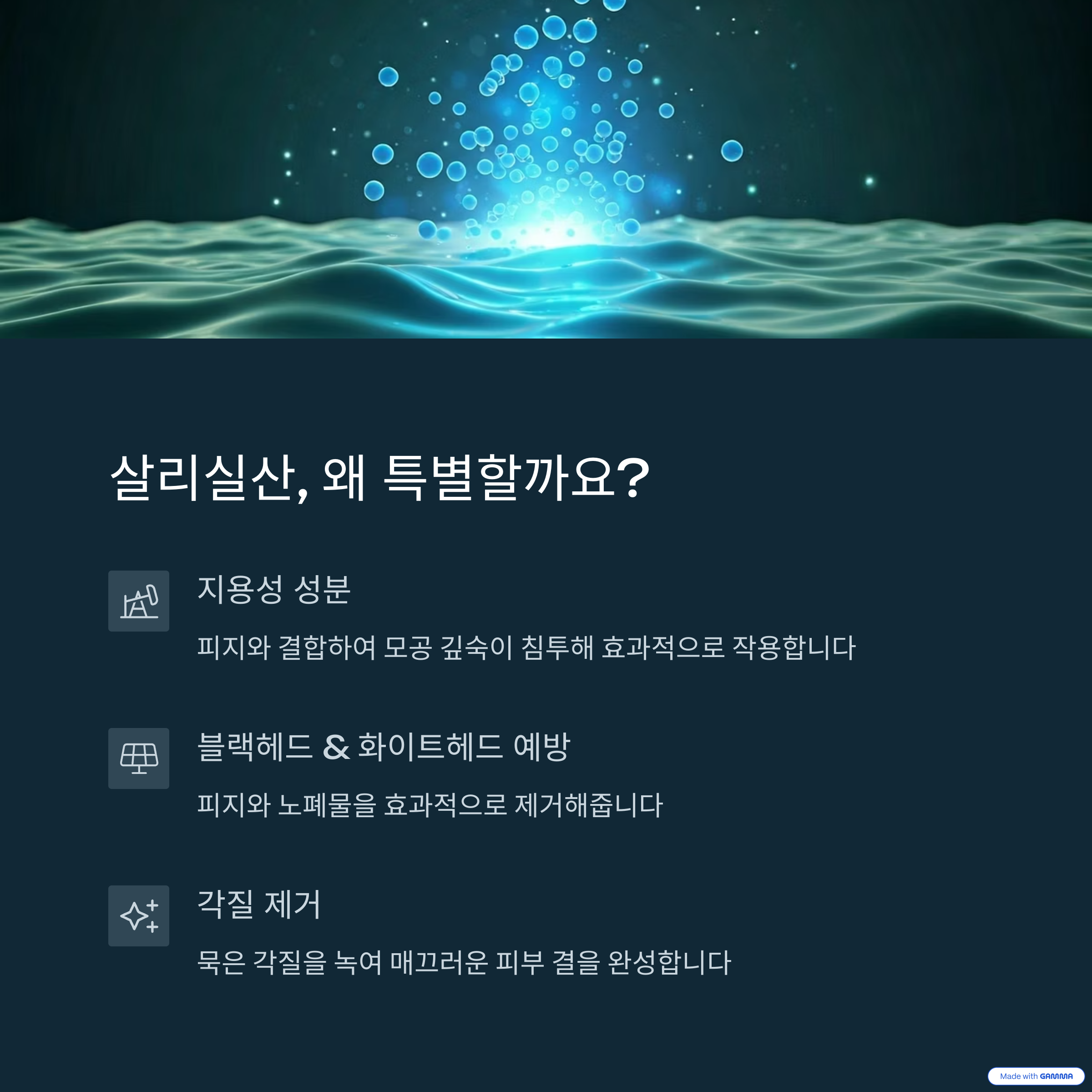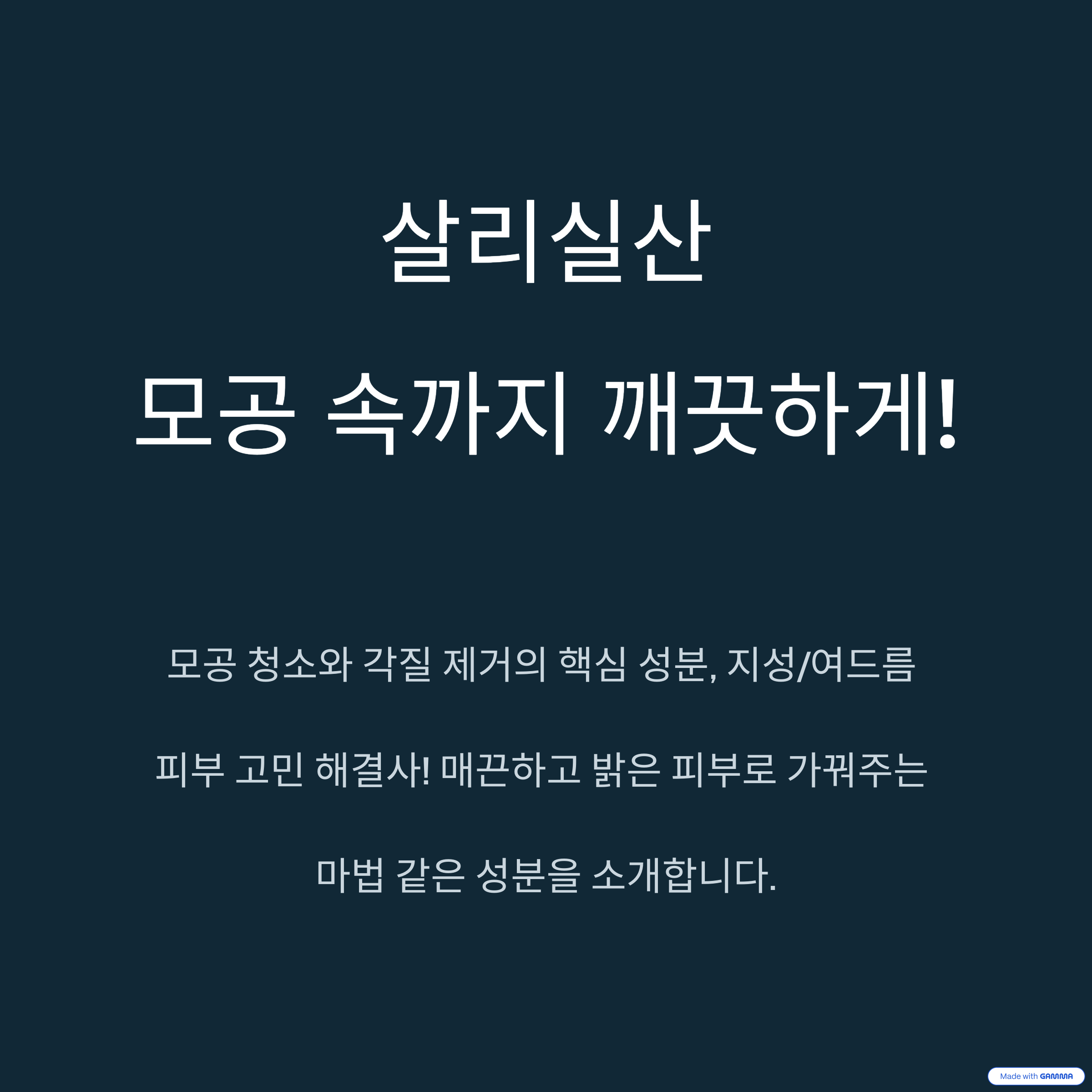 "살리실산은 피부 속까지 정리해주는 스마트한 각질 청소부이자, 여드름 피부의 든든한 해결사입니다."