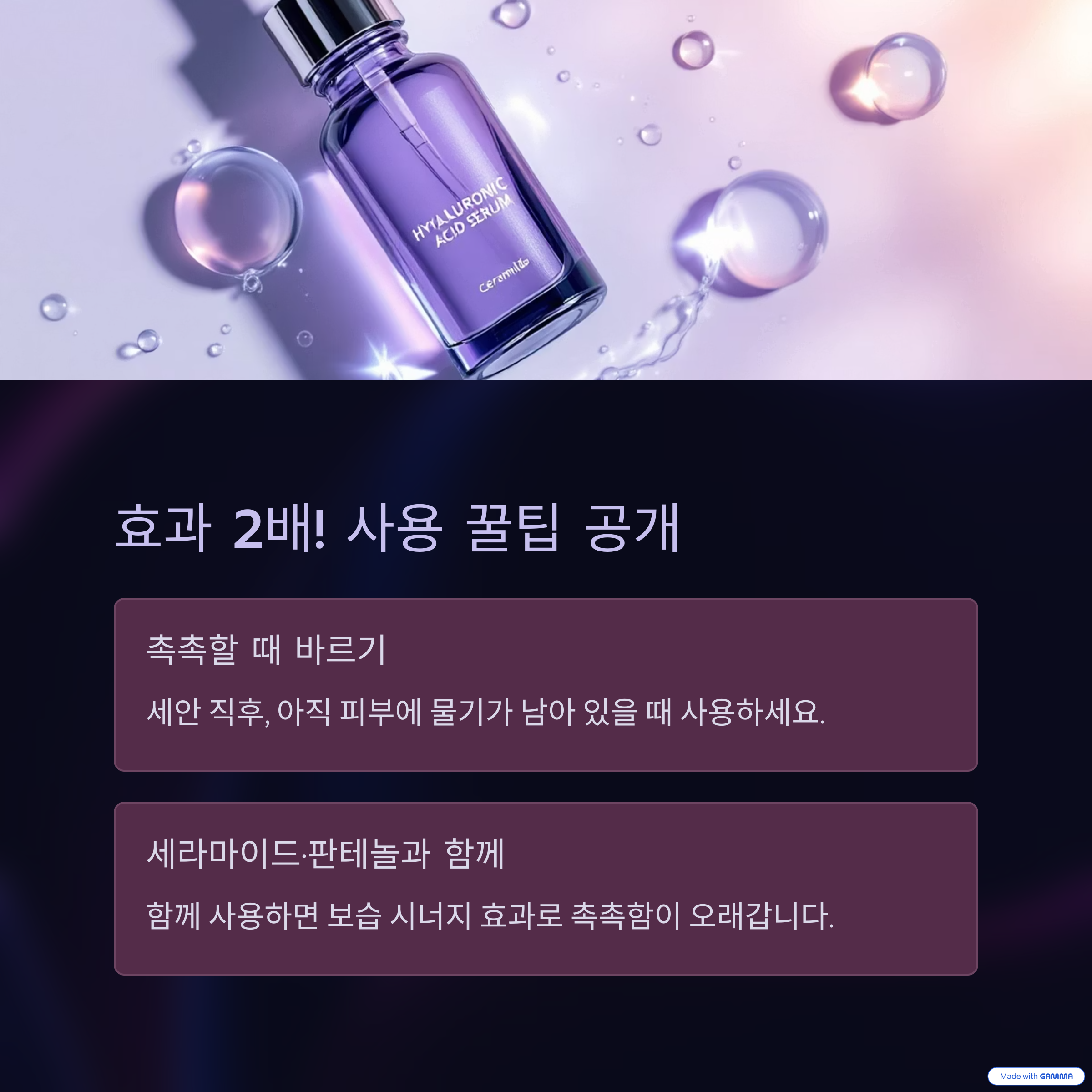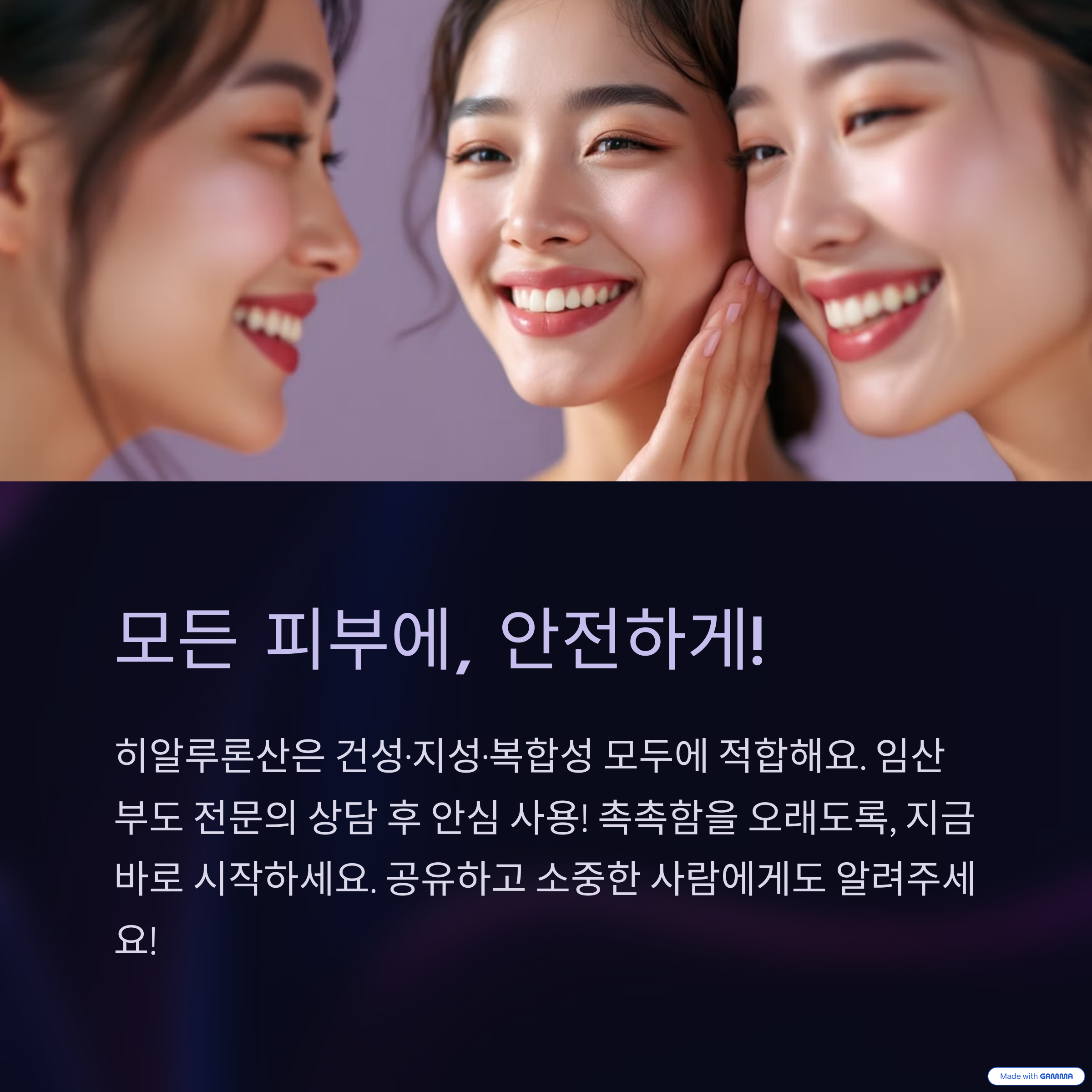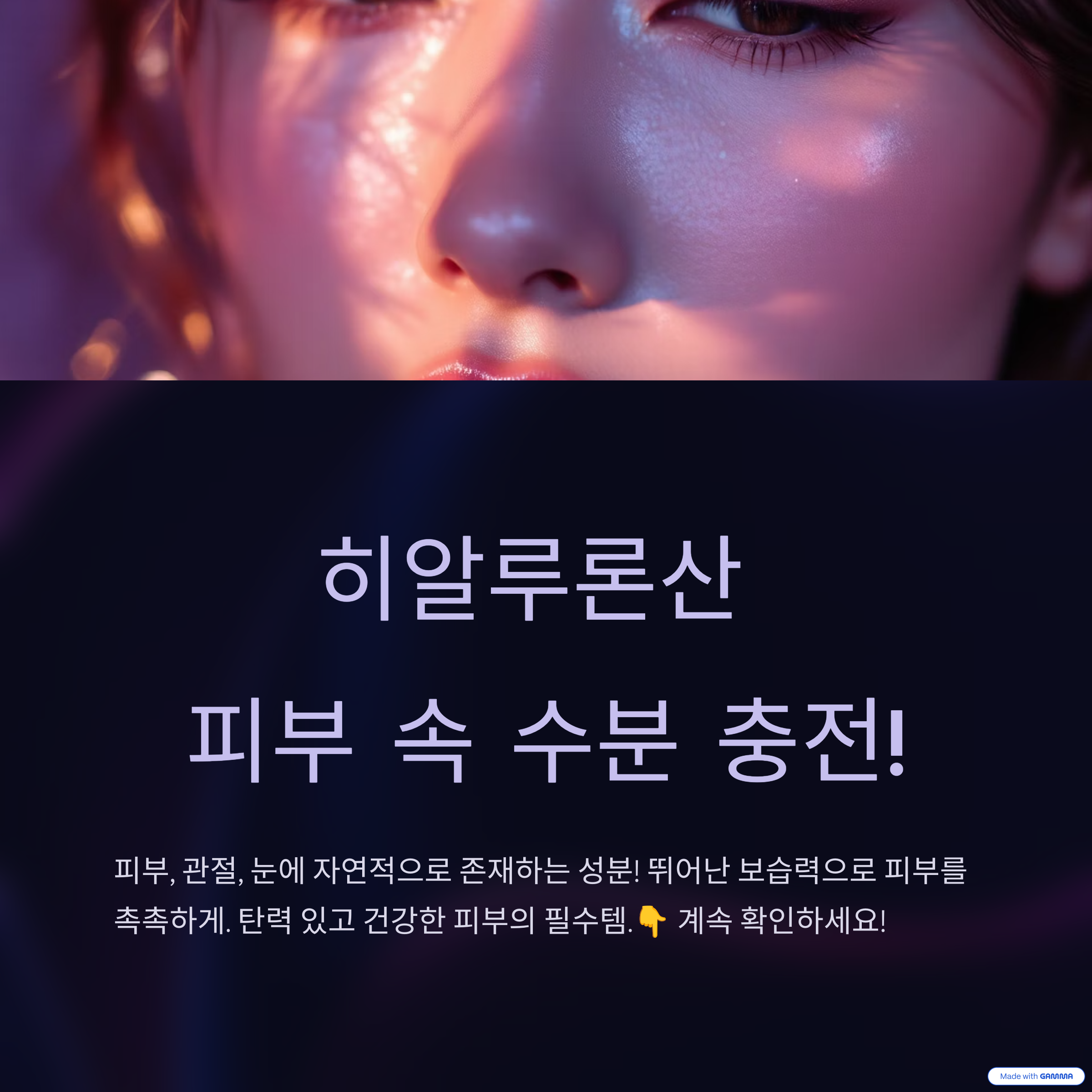 오늘은 히알루론산의 놀라운 보습 효과와 사용 방법에 대해 자세히 알아보았어요. 피부 속 수분을 꽉 잡아주는 히알루론산은 건성뿐만 아니라 모든 피부 타입에 필요한 성분이에요. 적절한 타이밍과 함께 올바른 제품을 선택해서 사용한다면, 더욱 건강하고 촉촉한 피부를 가꿀 수 있답니다. 지금 바로 화장대 위 히알루론산 제품을 다시 한번 확인해보세요. 여러분의 피부, 오늘보다 더 촉촉하게 바꿔보는 건 어떨까요?
