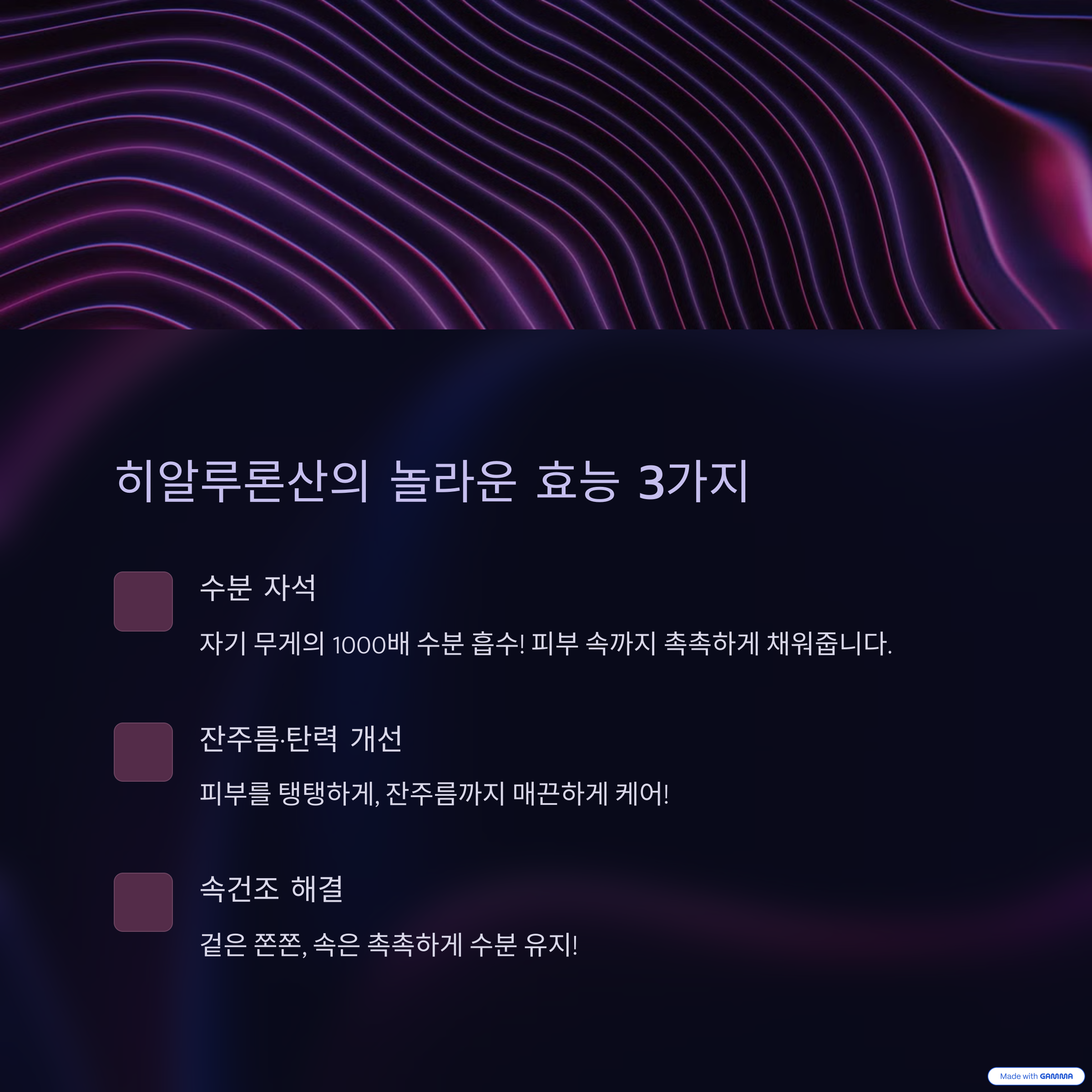 피부 수분을 유지하려면 외부 보습제보다 내부 수분을 잡아주는 히알루론산이 핵심입니다.