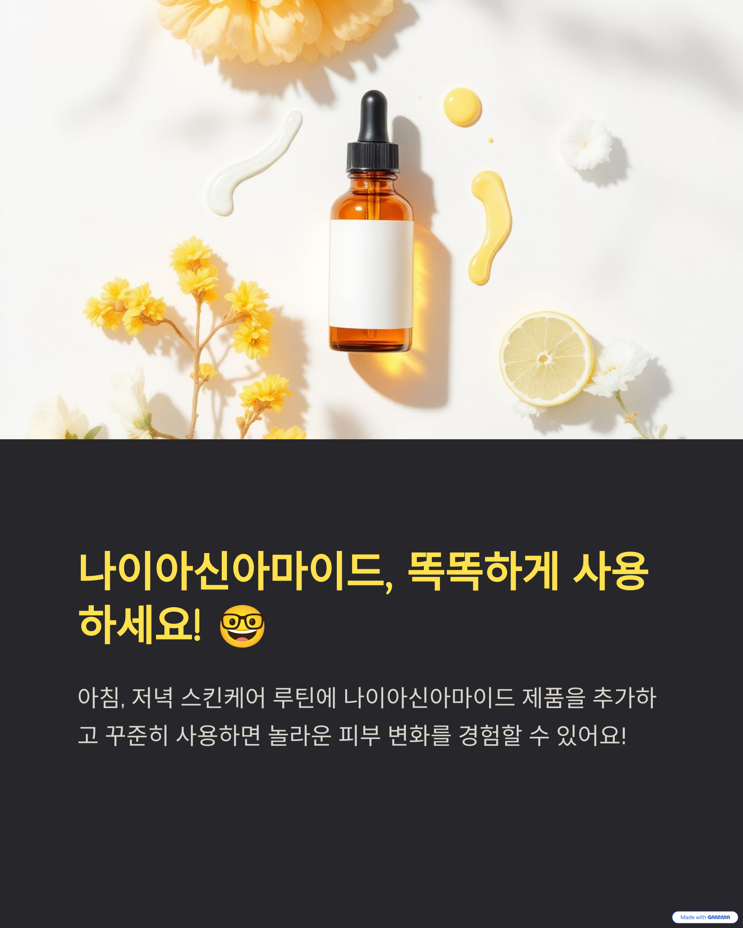 나이아신아마이드는 단순 미백 성분이 아닙니다. 멜라닌 억제, 피지 조절, 모공 축소, 피부 장벽 강화까지 피부 고민을 복합적으로 케어할 수 있는 스킨케어의 만능 키예요. 저자극이라 꾸준히 사용하기 좋고, 다양한 피부 타입에 널리 적용 가능한 성분이죠. 당신의 피부에 변화가 필요하다면, 오늘부터 나이아신아마이드 루틴을 시작해보세요.
