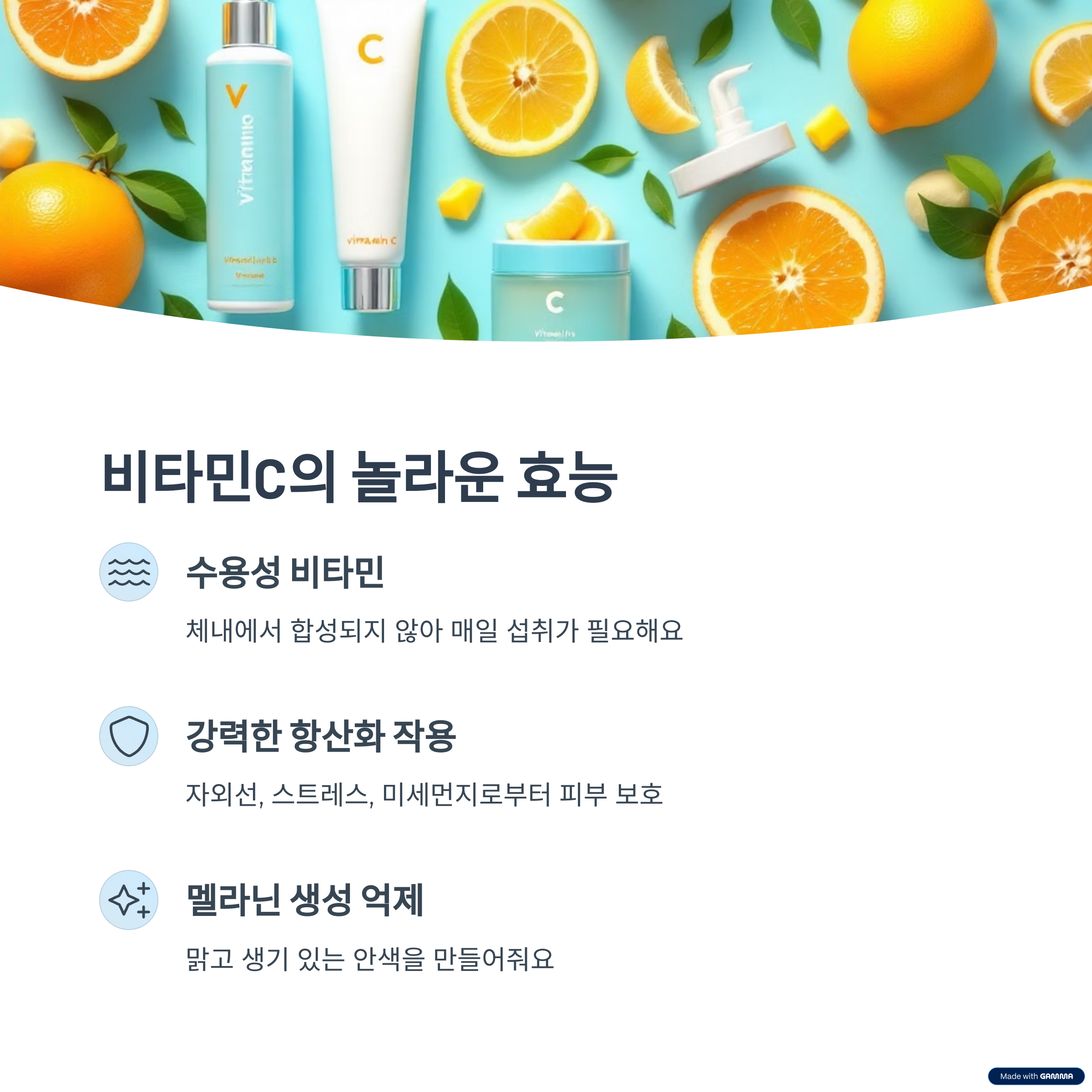 오늘은 빛나는 피부를 위한 핵심 성분, 비타민C에 대해 알아보았어요. 단순한 미백을 넘어 피부 전체 건강을 케어하는 데 중요한 역할을 하죠. 매일 꾸준한 섭취와 적절한 외용 제품의 사용은 여러분의 피부를 한층 더 환하고 생기 있게 만들어 줄 거예요. 작은 습관이 큰 변화를 만들 수 있다는 것, 잊지 마세요. 앞으로도 건강하고 맑은 피부를 위한 유익한 정보로 다시 찾아뵐게요!