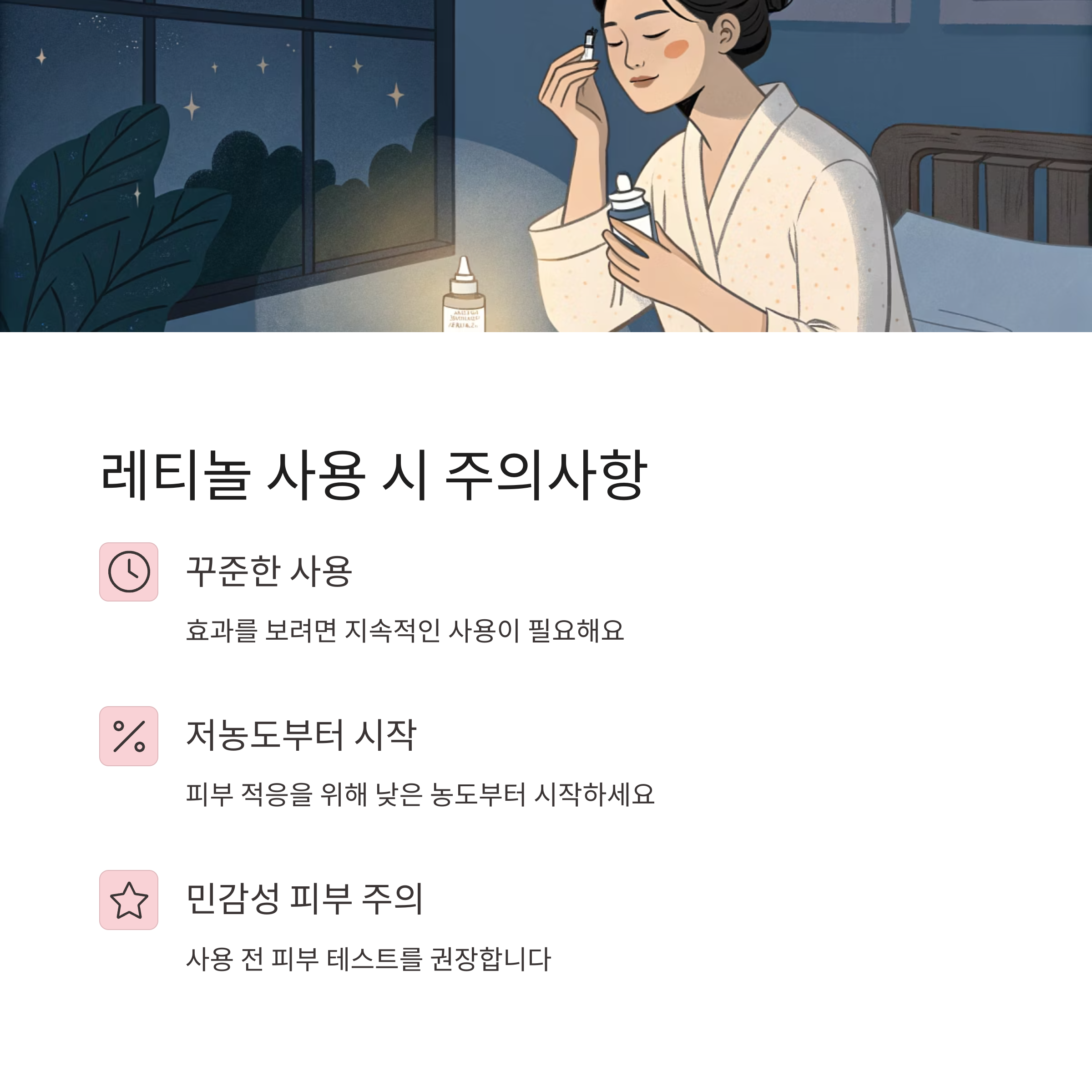 레티놀은 꾸준한 사용이 중요하며, 사용 초기에 각질이나 붉어짐이 생길 수 있어 저농도부터 천천히 시작하는 것이 좋습니다.