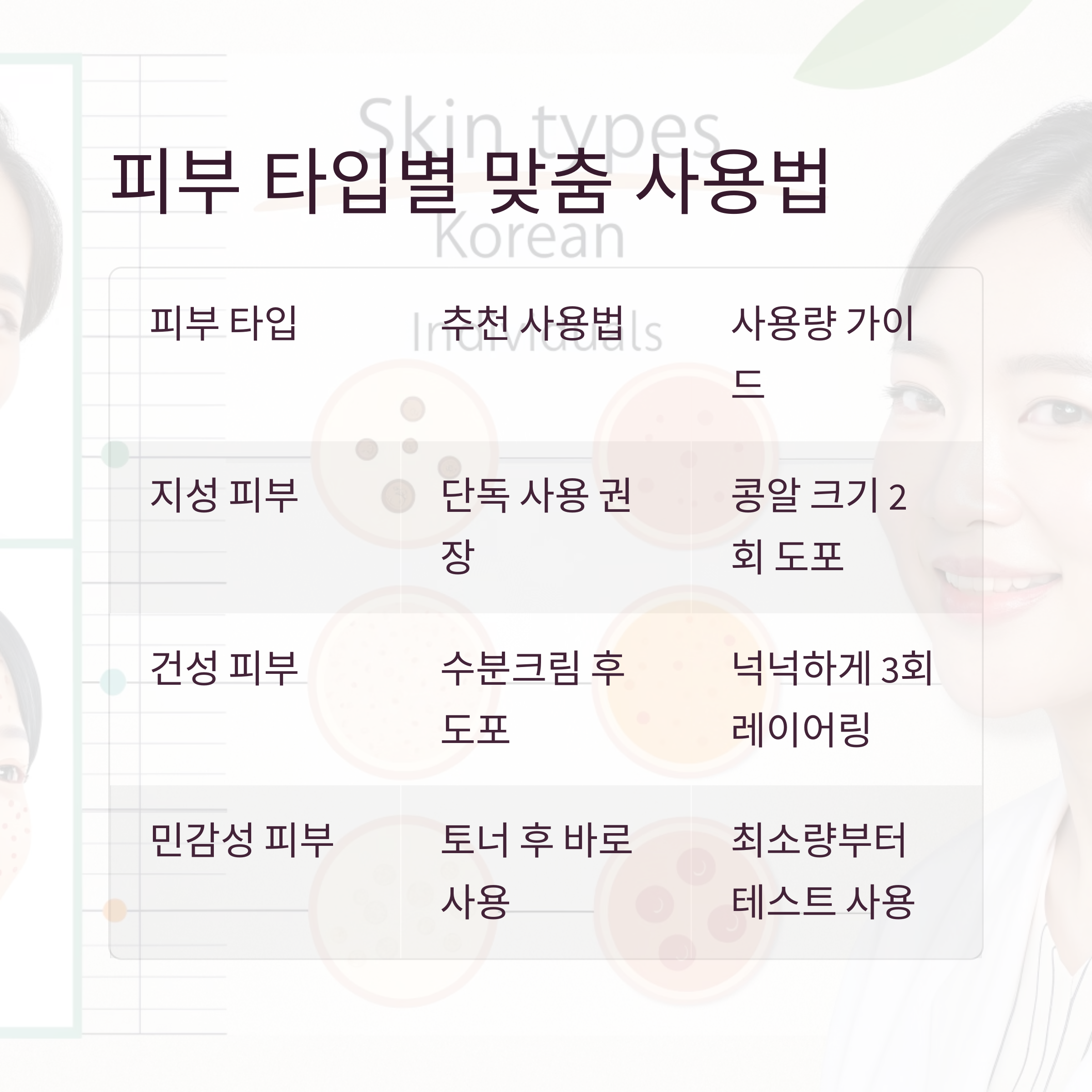 | 민감성 피부 | 토너 후 바로 사용 | 최소량부터 테스트 사용 |