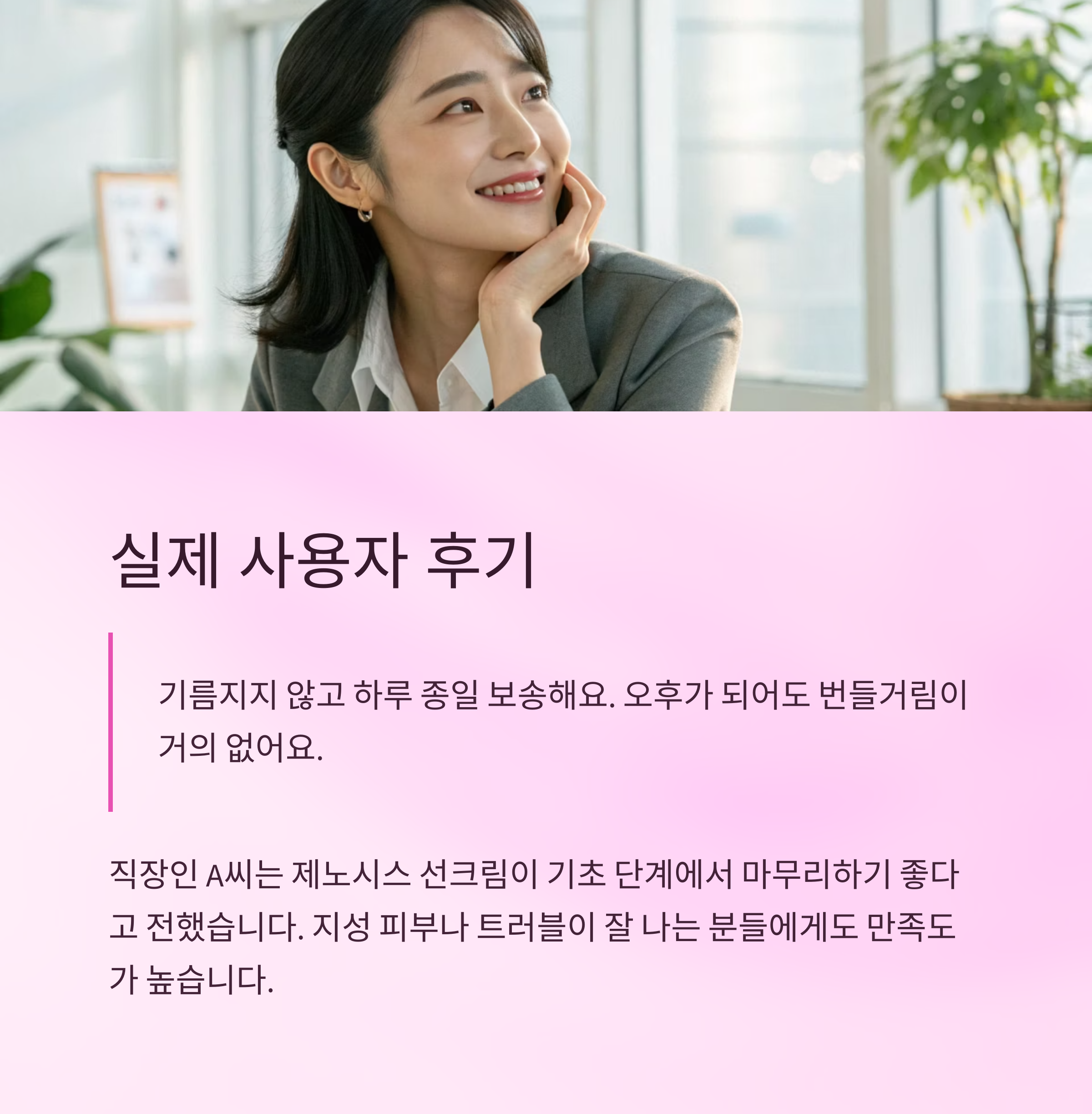 직장인 A씨는 제노시스 선크림 사용 후 "오후가 되어도 번들거림이 거의 없다"며