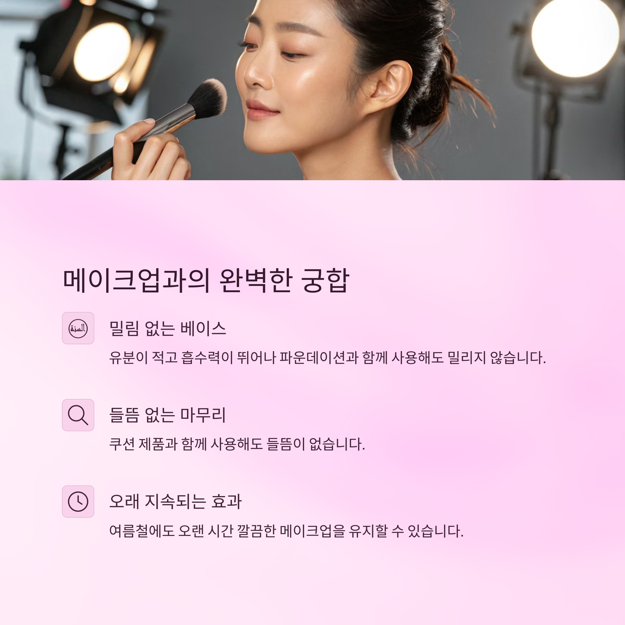 파운데이션이나 쿠션 제품과 함께 사용해도 밀리지 않고 들뜸이 없습니다
