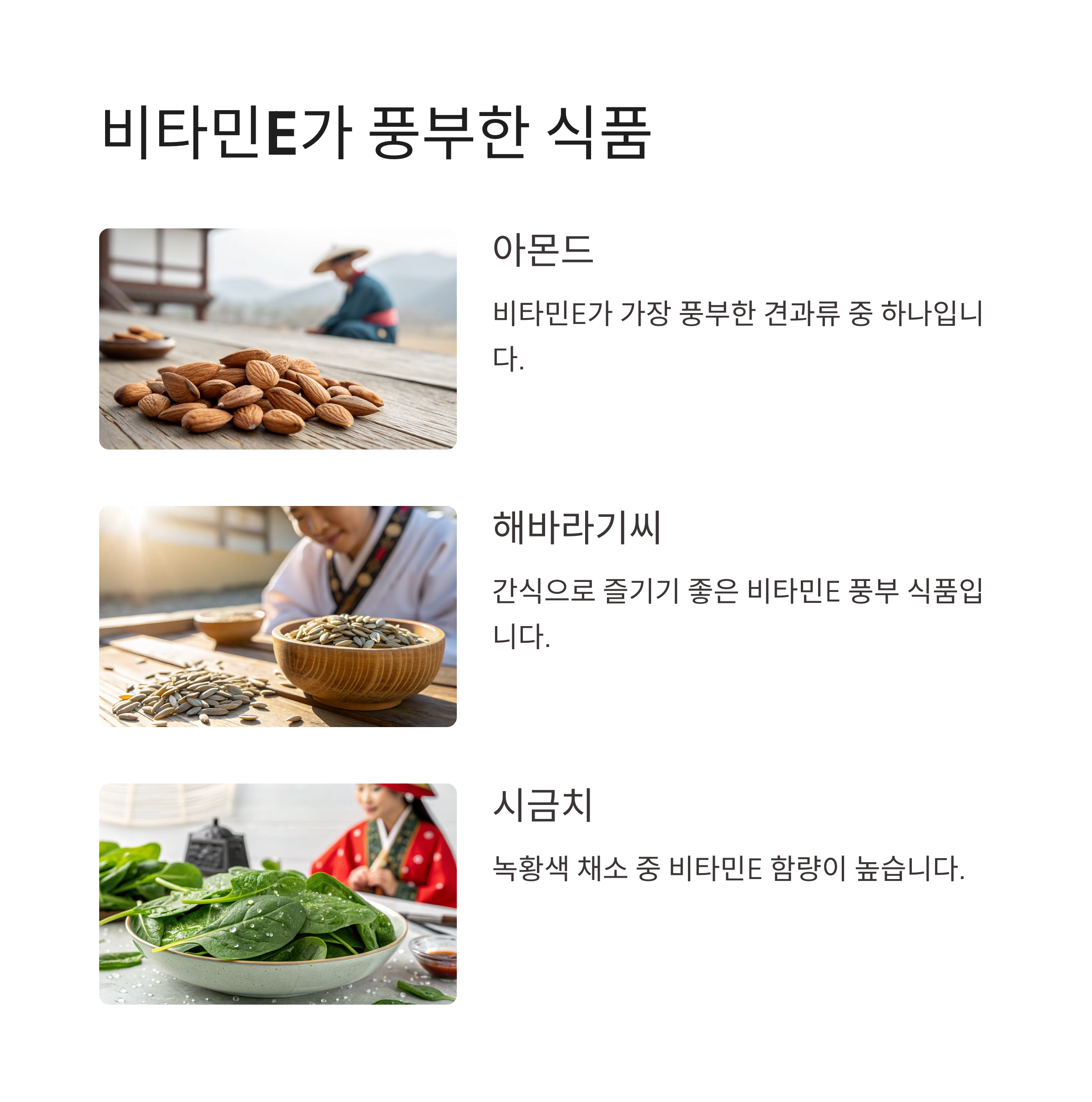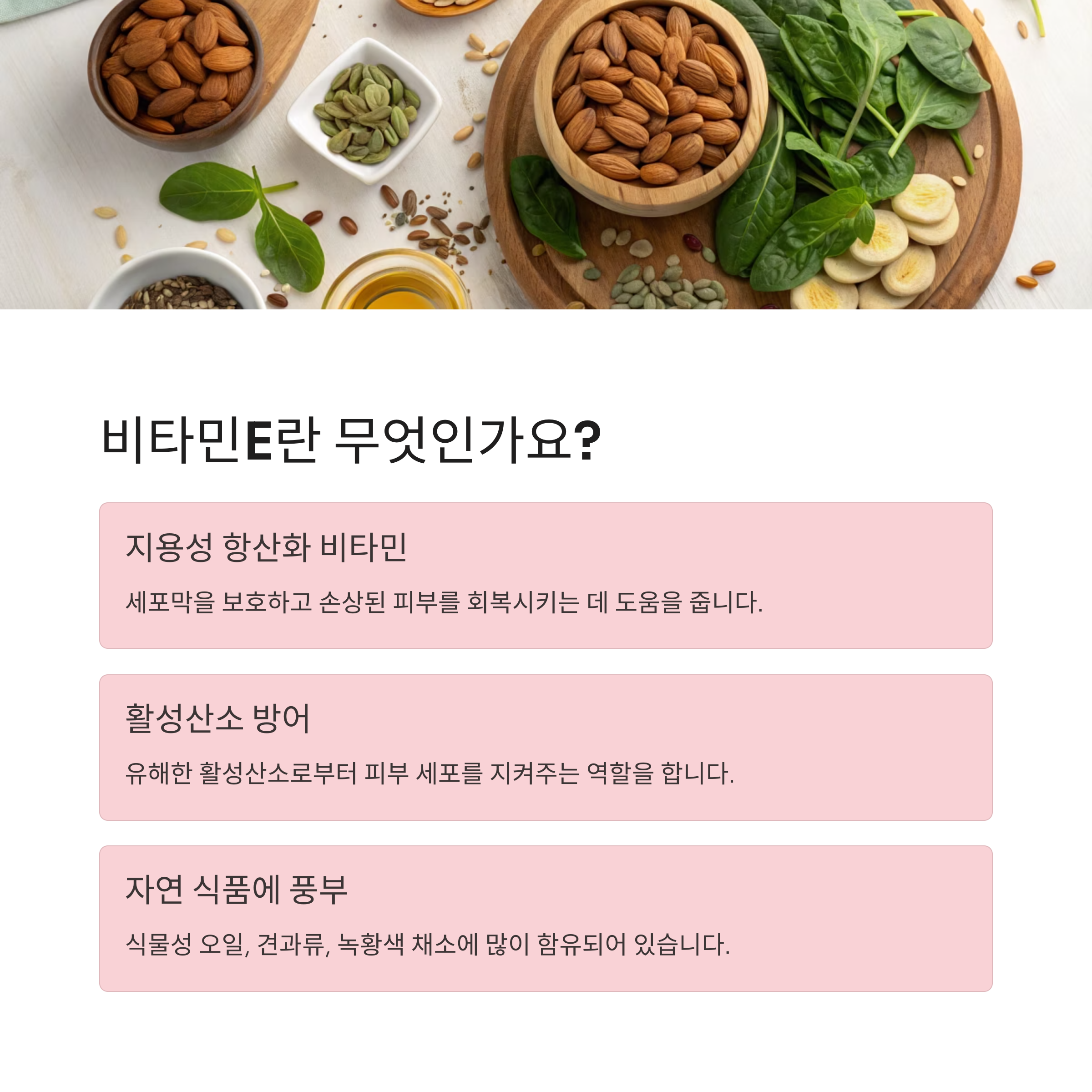 | 풍부한 식품 | 아몬드, 해바라기씨, 시금치 등 | 자연식품에서 섭취 가능 |