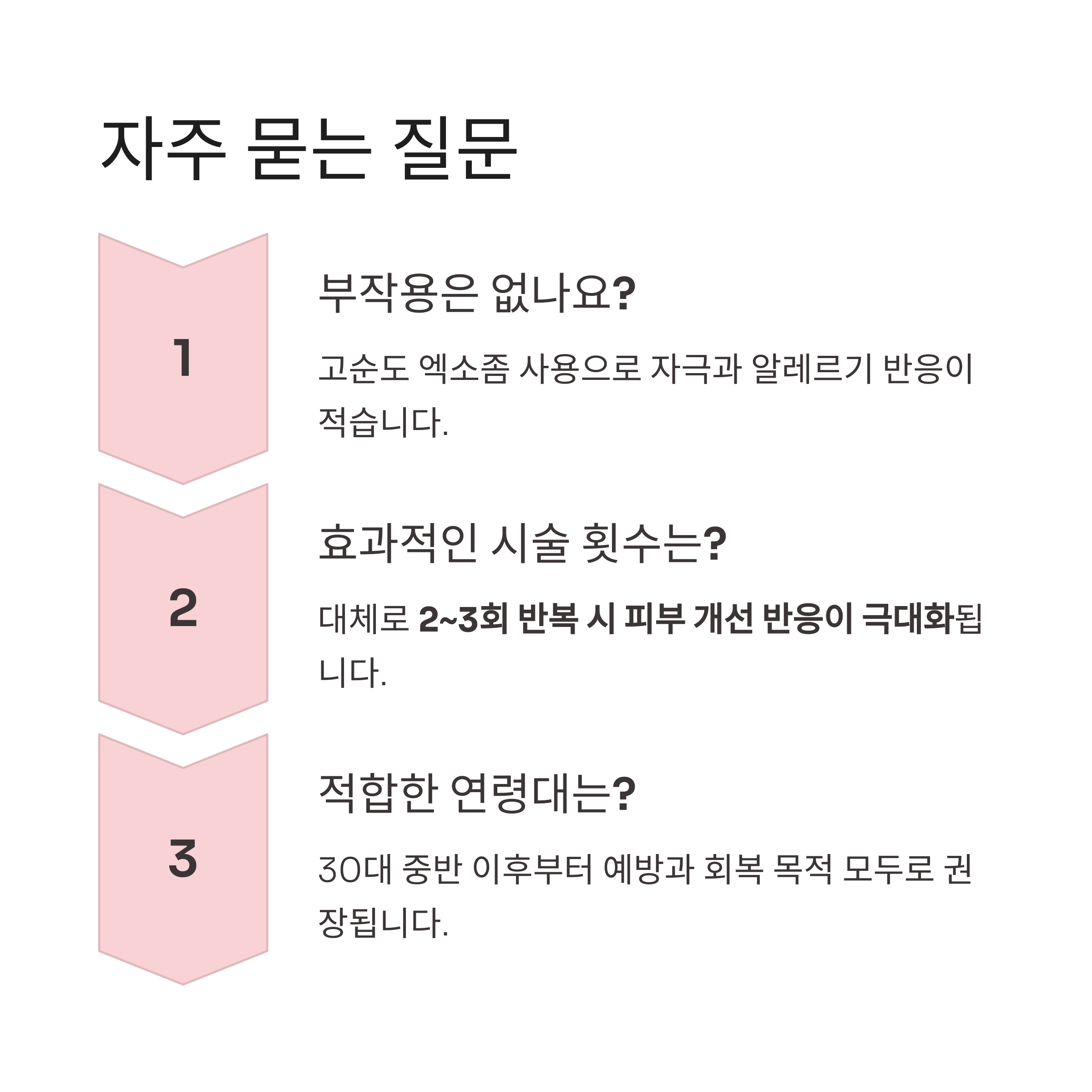 A: 대체로 2~3회 반복 시 피부 개선 반응이 극대화됩니다.