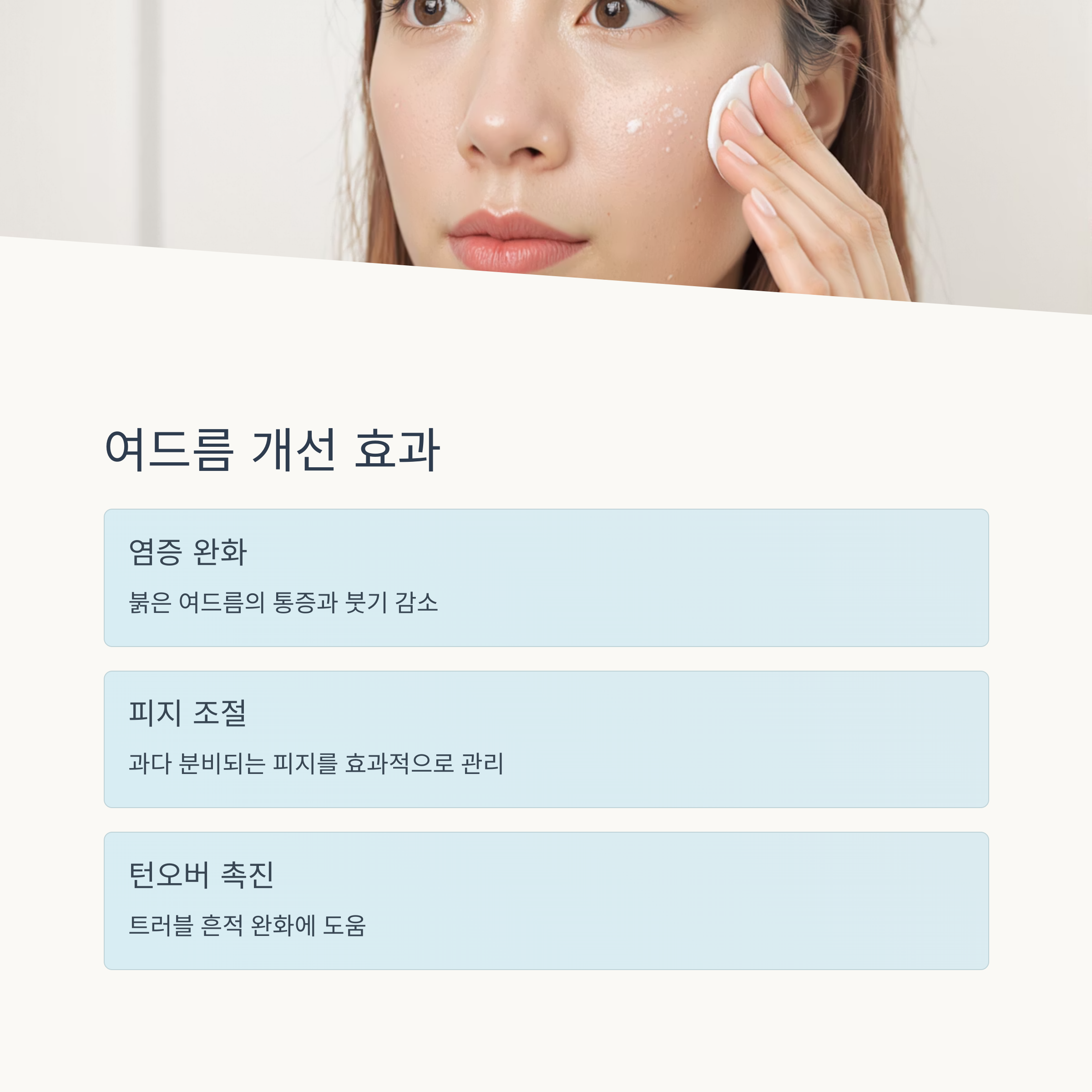 | 항염 작용 | 여드름 붉은기와 통증 완화 | 피부 자극 적음 |