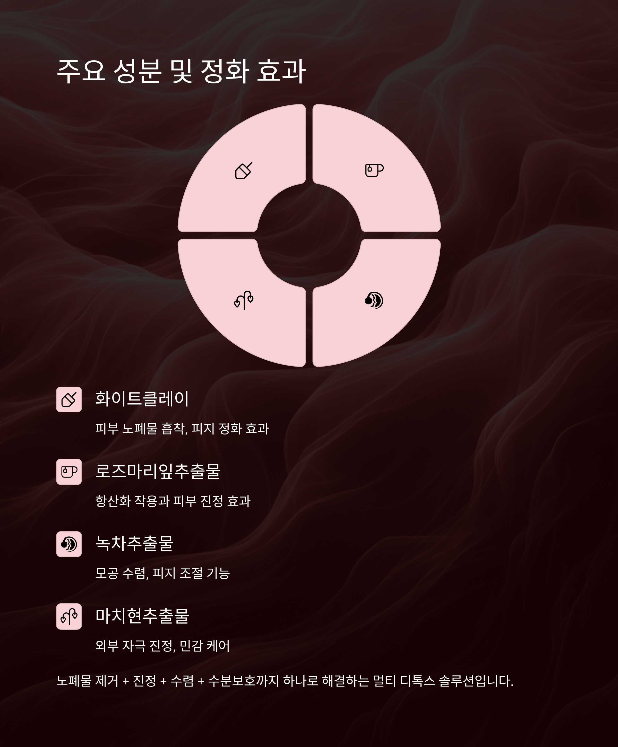 피부에 부담을 주지 않으면서도 묵은 각질과 피지를 부드럽게 정돈해주는 조합으로, 민감한 피부도 안심하고 사용할 수 있어요. 노폐물 제거 + 진정 + 수렴 + 수분보호까지 하나로 해결하는 멀티 디톡스 솔루션입니다.