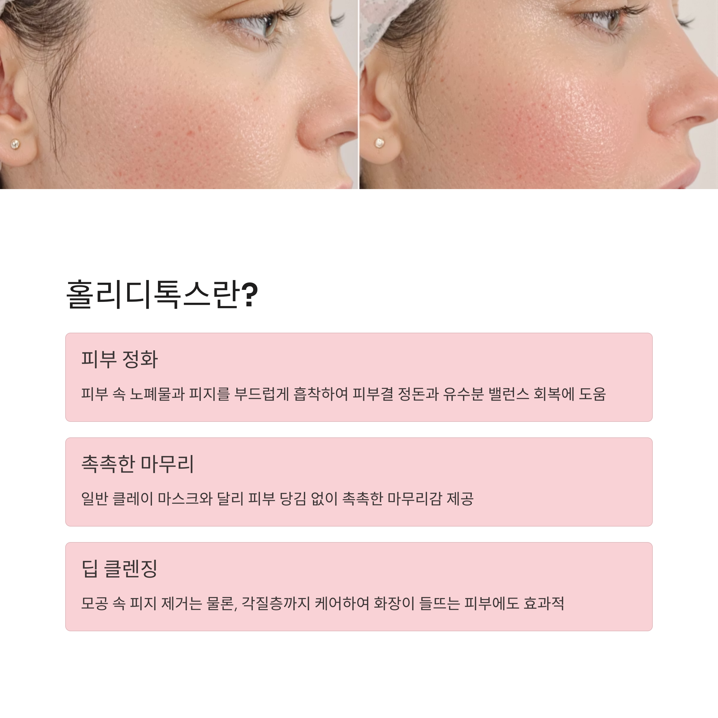 일반적인 클레이 마스크와 달리 피부 당김 없이 촉촉한 마무리감이 특징이며, 모공 속 피지 제거는 물론, 각질층까지 케어하여 화장이 들뜨는 피부에도 효과적이에요.